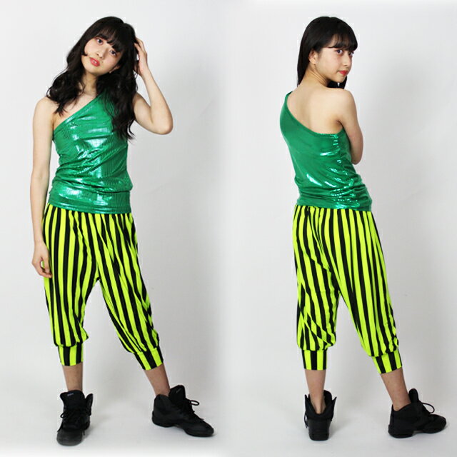 キッズ ダンス衣装 ヒップホップ パンツ ストライプ サルエル BPPJ-02[子供 衣装 ガールズ 男の子 縦縞 発表会 派手 目立つ HIPHOP よさこい ジュニア ジャズ ダンス 服 蛍光 黒 黄色 グリーン オレンジ ピンク 韓国 ]