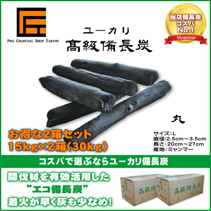ユーカリ 高級 備長炭 Lサイズ 丸15kg×2箱(30kg)セット 直径2.5cm〜3.5cm 長さ20cm〜27cm 防災用 飲食店 エコ備長炭♪業務用 飲食店 焼鳥 炉端 BBQ キャンプ お花見 居酒屋 鰻 お勧め!燃料 暖房 調湿 消臭 浄水にも最適♪★炭や匠★12時までのご注文で即日発送★